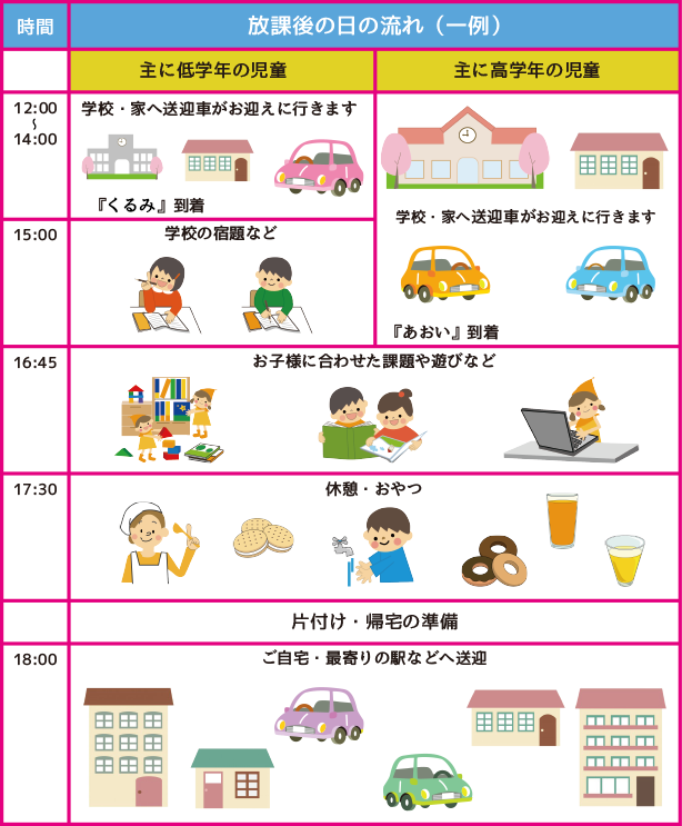 ■ 各学年、学校に合わせた下校時刻に送迎車が校門までお迎えにいきます。